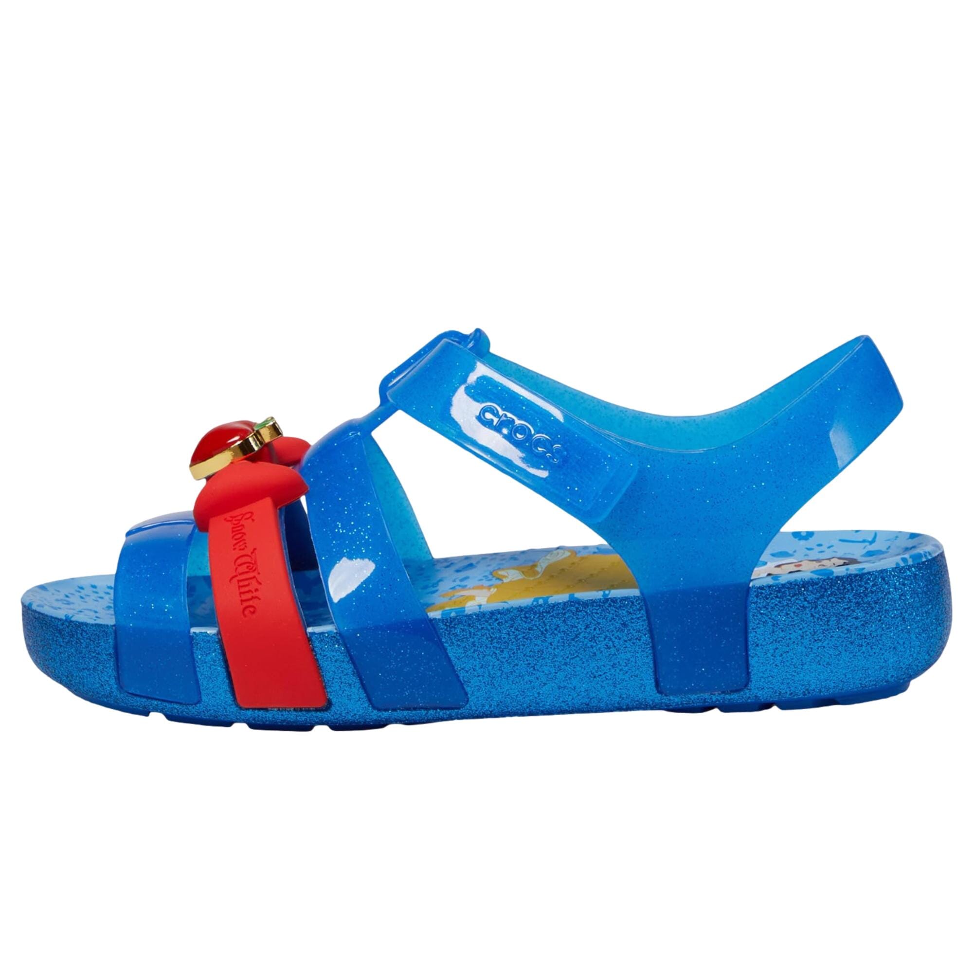 The Crocs Snow White Isabella Sandal brings Disney magic to a lightweight summer style. Featuring translucent straps decorated with Snow White–themed details, it offers a secure and flexible fit for kids. Built with Croslite™ foam, it provides cushioned comfort and all-day wearability, while the durable outsole ensures reliable traction. Water-friendly and easy to clean, this sandal blends playful fairy-tale charm with Crocs’ signature comfort.
